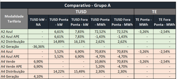 Abaixo variação das tarifas do RTA de 23.10.2022 (REH nº 3.128/2022) versus RTA de 23.10.2021 (REH 2.966/2021) – da Média e Alta Tensão