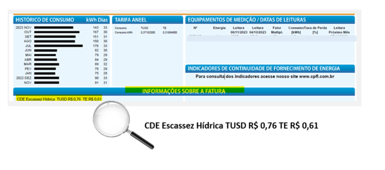 O objetivo dessa informação é apenas demonstrar o valor relacionado à Conta de Escassez Hídrica em sua fatura mensal de energia elétrica. Esse valor está contido nas tarifas de Consumo TUSD (Tarifa do Uso do Sistema de Distribuição) e de Consumo TE (Tarifa do consumo de Energia) publicadas anualmente pela ANEEL.