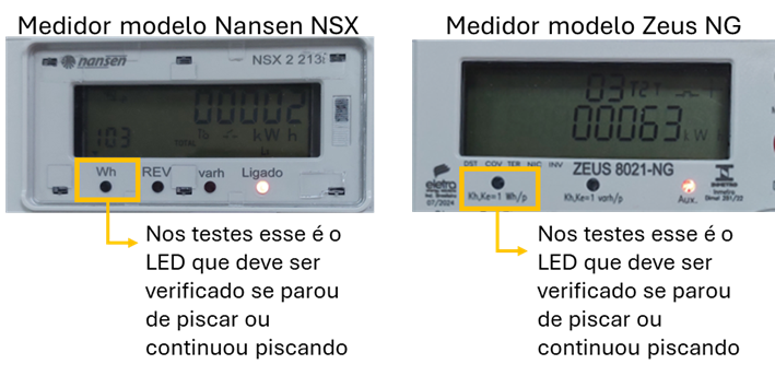 Caso o LED da descrição “Wh” do medidor continue piscando é necessário continuar com o teste para verificar se o problema está no medidor ou na instalação elétrica.