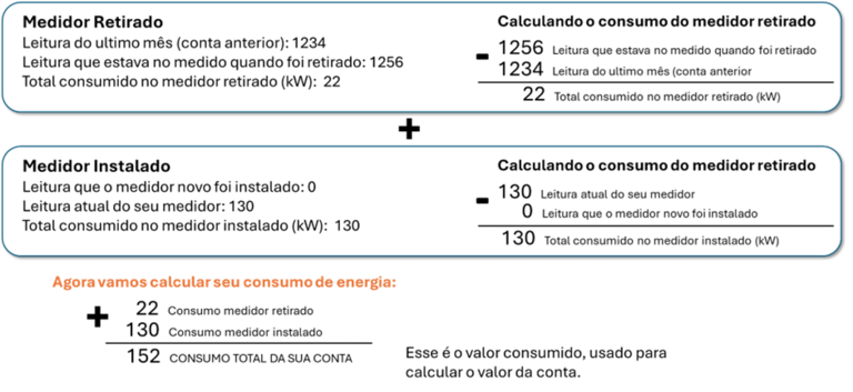 A primeira conta após a troca do medidor será calculada com o consumo registrado no medidor antigo até a data da troca e o consumo do novo medidor.